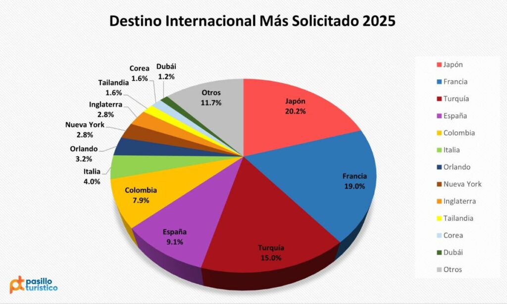 Japón se coloca como el destino internacional más solicitado del año, concentrando el 20.2% de las preferencias, reflejo de su fuerte posicionamiento cultural, su conectividad creciente y el atractivo que ejerce entre viajeros que buscan experiencias distintas y bien estructuradas.