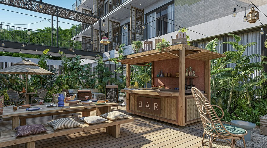 El corazón social de la propiedad es el Moxy Bar & Restaurant, un espacio que fusiona la vida interior y exterior en un ambiente desenfadado y artístico. Aquí, los huéspedes pueden disfrutar de cocteles de autor, cervezas artesanales y tapas inspiradas en la gastronomía regional, bajo un techo adornado con lámparas de arcilla, tótems tejidos y un dosel de cuerdas entrelazadas que crean una atmósfera cálida y fotogénica.